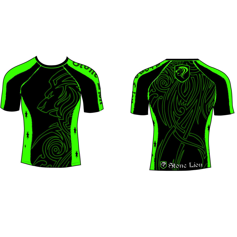 Short sleeve polyester /spandex rash guards featuring flatlock stitching ,bacterial inhibiting material, digital sublimation printed designs